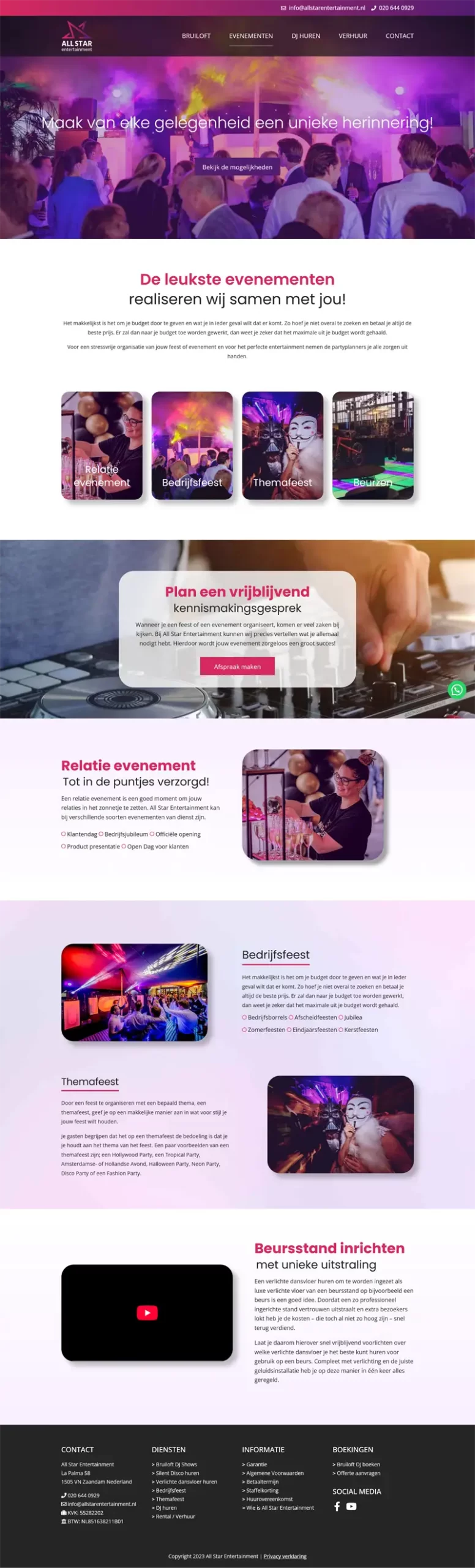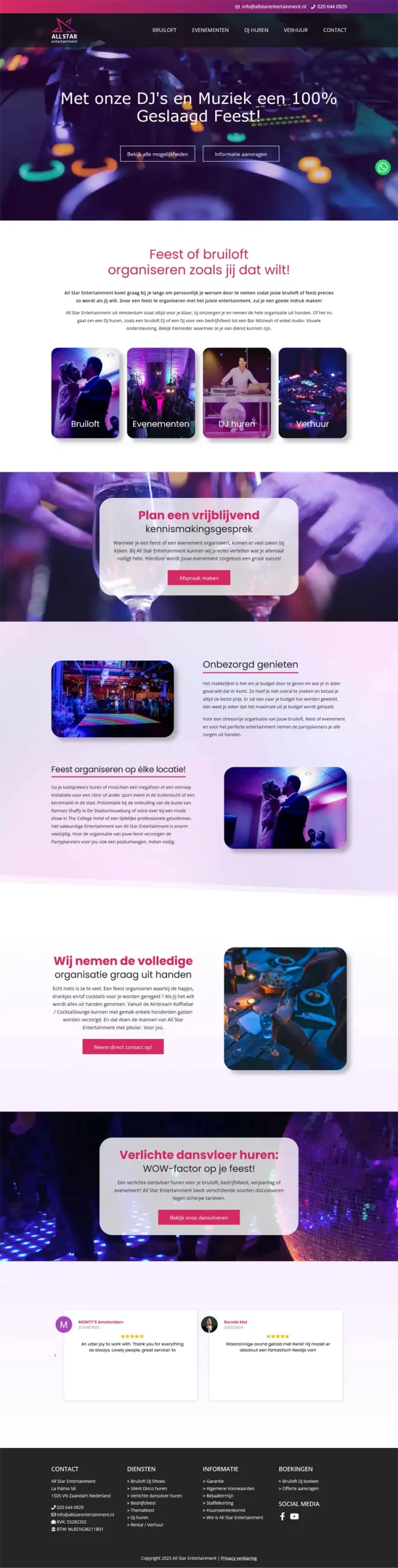 Wij hebben de website van All Star Entertainment vernieuwd om de energie van hun feesten ook online voelbaar te maken. Bezoekers kunnen eenvoudig een DJ inhuren of apparatuur reserveren voor bruiloften, feesten en andere evenementen.