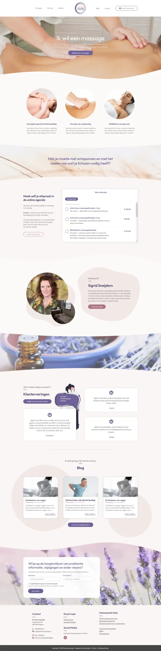 Voor Ik Wil Een Massage hebben wij een rustgevende website ontworpen waar bezoekers eenvoudig verschillende soorten massages kunnen ontdekken en boeken. De zachte kleuren en vloeiende vormen zorgen voor een kalme, uitnodigende sfeer die aansluit bij het gevoel van ontspanning dat de massages bieden.
